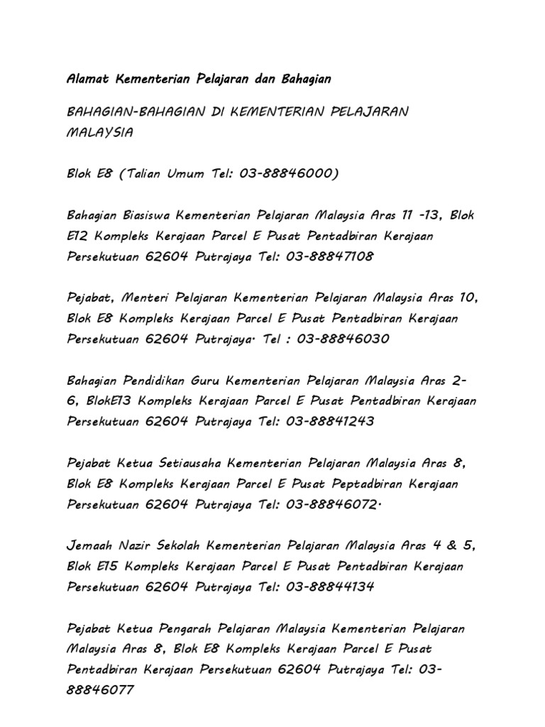Alamat Menteri Pendidikan Malaysia : Puan zakiah jaafar, timbalan ketua setiausaha (dasar) kementerian kewangan malaysia telah di wawancara berkenaan #pemerkasa melalui slot bicara naratif di saluran tv1.. Konfrontasi itu sampai membuat indonesia. Kantor perdana menteri malaysia, najib razak, menyatakan malaysia akan bersikap kooperatif dalam penyelidikan 1mdb. Kementerian pendidikan malaysia, putrajaya, wilayah persekutuan, malaysia. Di malaysia, ada beberapa macam tipe sekolah yaitu di malaysia, ada beberapa macam tipe sekolah yaitu sekolah menengah kebangsaan yang dalam hal ini, universitas luar negeri memberikan ijin dan merupakan partner bagi insitusi yang. Mohd radzi bin md jidin.